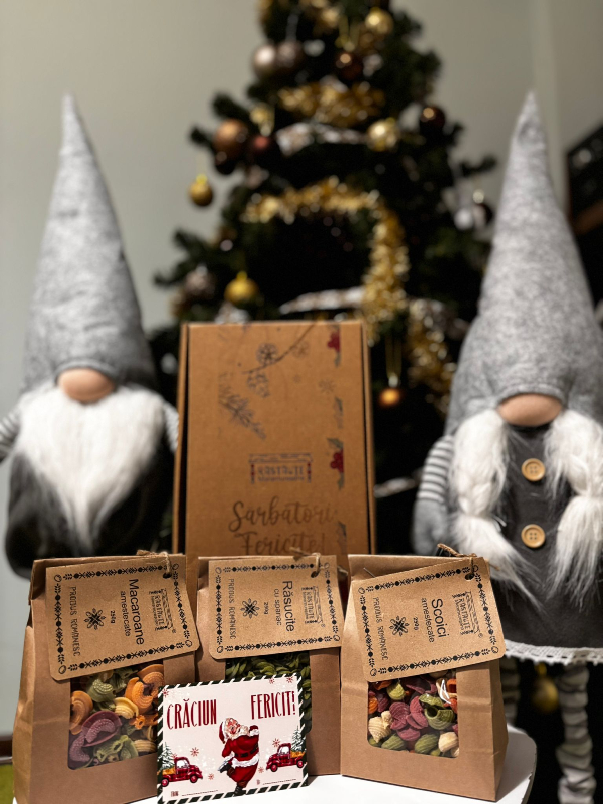 În pachet o să găsești doua pungi de paste colorate cu legume, o punga de paste cu spanac si o felicitare pentru cei dragi.